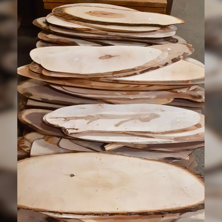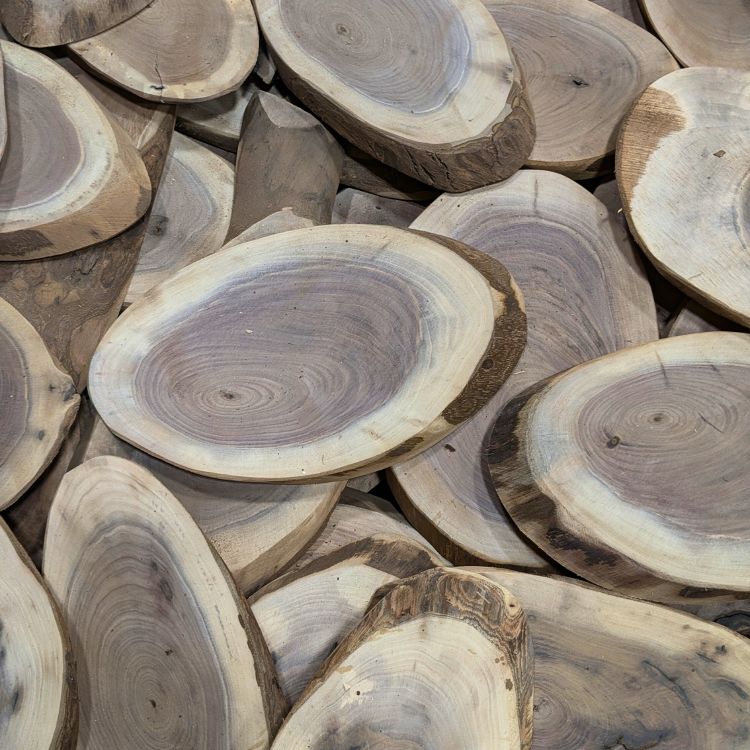 Diagonally cut from large limbs and small trunks, these oval-shaped (mostly, but it is a natural product) cookies make very nice serving boards for charcuterie and cheeses. Larger pieces make interesting coffee or end tables, as do the exotics. Walnut, Maple, and Ash are usually available; other species are occasionally available. Various Sizes available from small to extra large.